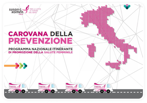 La Carovana della Prevenzione è il Programma Nazionale Itinerante di Promozione della Salute Femminile di Komen Italia che offre ad un pubblico sempre più ampio attività gratuite di sensibilizzazione e prevenzione delle principali patologie oncologiche di genere.