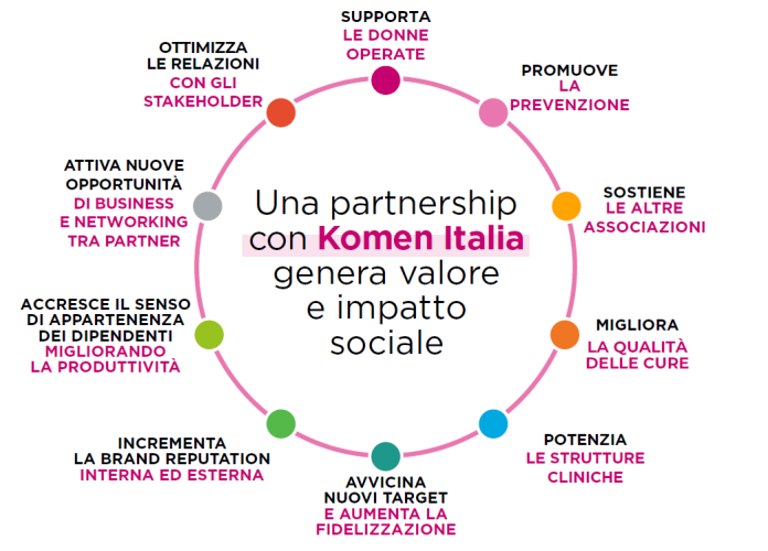 Komen Italia sviluppa da anni partnership virtuose con aziende nazionali ed internazionali, Enti ed Istituzioni.