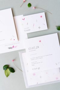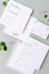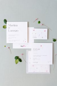 Una partecipazione semplice e allo stesso tempo elegante in stile botanico, composta da busta trasparente e 3 biglietti di diverso formato: partecipazione, invito e biglietto lista nozze, il tutto delicatamente impreziosito da delicati fiori e foglie.