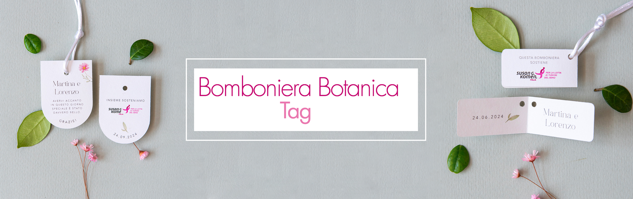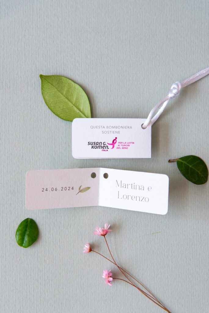 Il biglietto Tag solidale può essere usato per personalizzare qualsiasi prodotto (bomboniere, segnaposto, pacchetti regalo). In due formati rettangolare o stondato, abbellito da fiori e foglie.