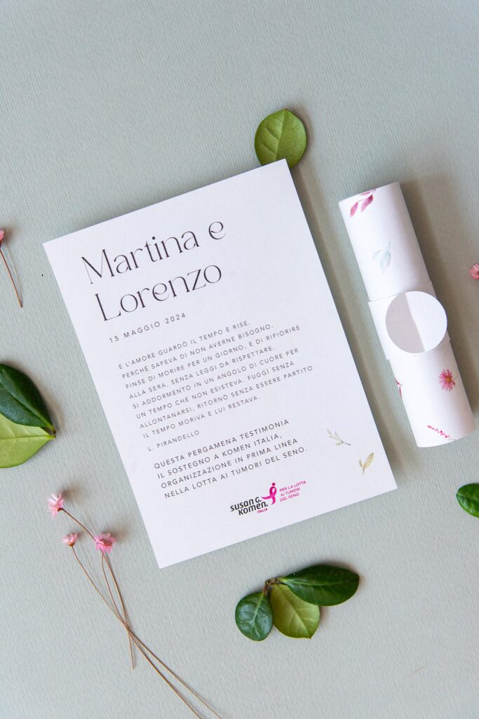 Il biglietto è personalizzabile con nome/nomi e data dell’evento, ed è completo di nastrino.