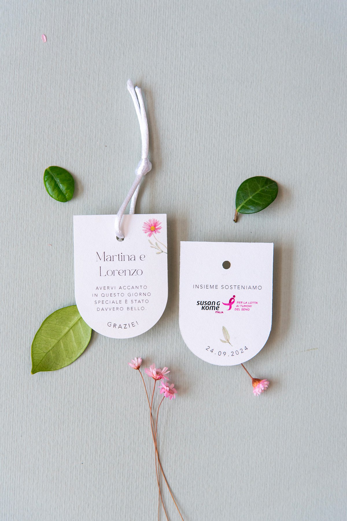 Il biglietto Tag solidale può essere usato per personalizzare qualsiasi prodotto (bomboniere, segnaposto, pacchetti regalo). In due formati rettangolare o stondato, abbellito da fiori e foglie.