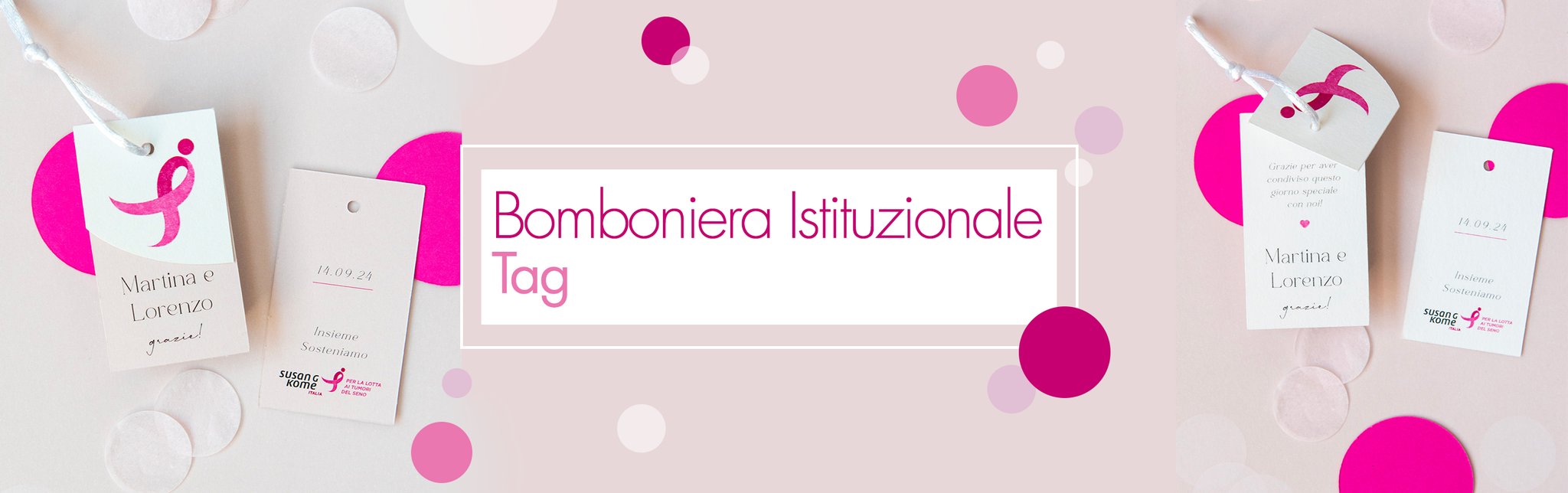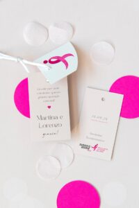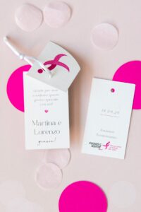 Il bigliettino tag solidale può essere usato per personalizzare qualsiasi prodotto (bomboniere, segnaposto, pacchetti regalo). Composto da due bigliettini, di cui uno impreziosito dal Ribbon Rosa simbolo di Komen Italia.