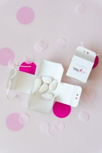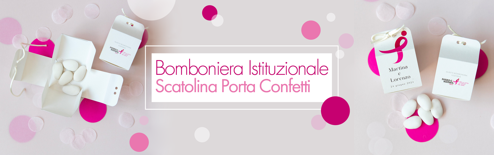 La scatolina porta confetti istituzionale è minimal ed elegante, con la presenza del Ribbon Rosa, simbolo di Komen Italia. È composta da due elementi di facile montaggio e chiusura con nastrino.