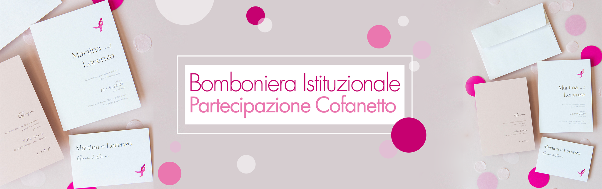 Una partecipazione istituzionale minimal composta da busta bianca e 3 biglietti di diverso formato: partecipazione, invito e biglietto lista nozze; il tutto delicatamente decorato con il Ribbon Rosa, simbolo della Komen italia.