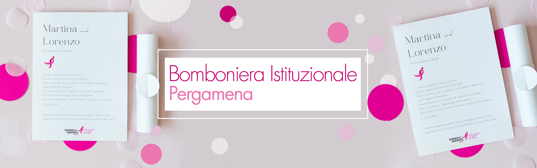 Scrivi a propostesolidali@komen.it o chiama allo 06.35405530 per avere più informazioni, specificando la data dell’evento, quantitativo desiderato e la tipologia della bomboniera scelta.