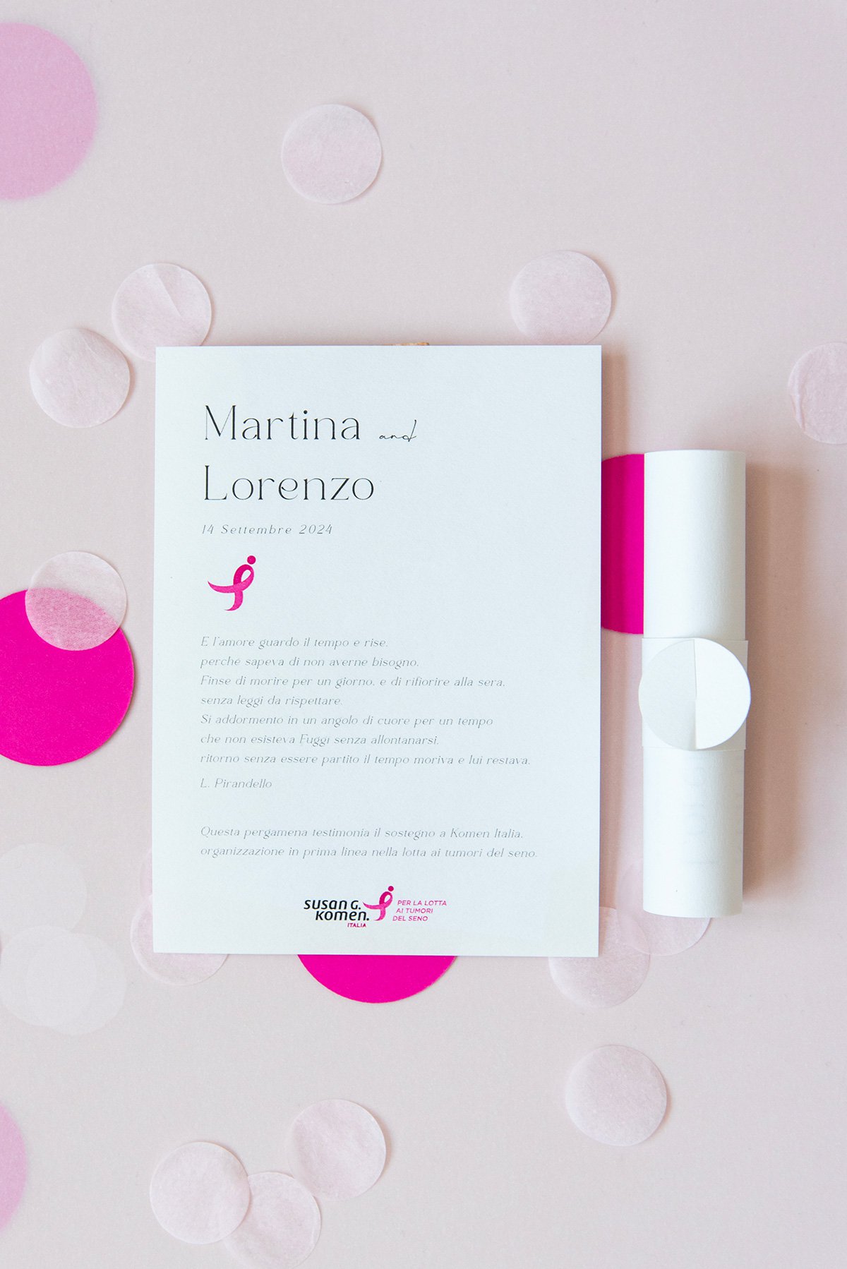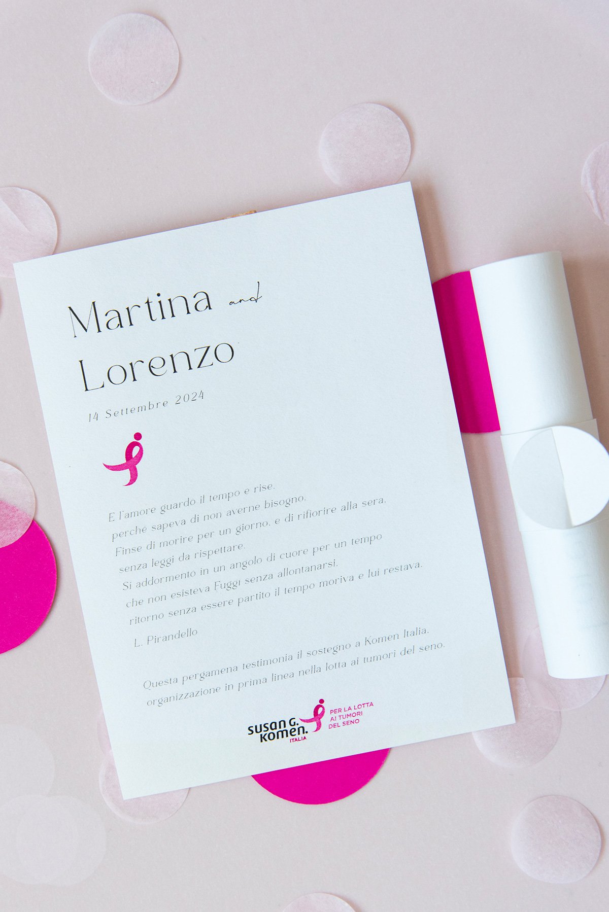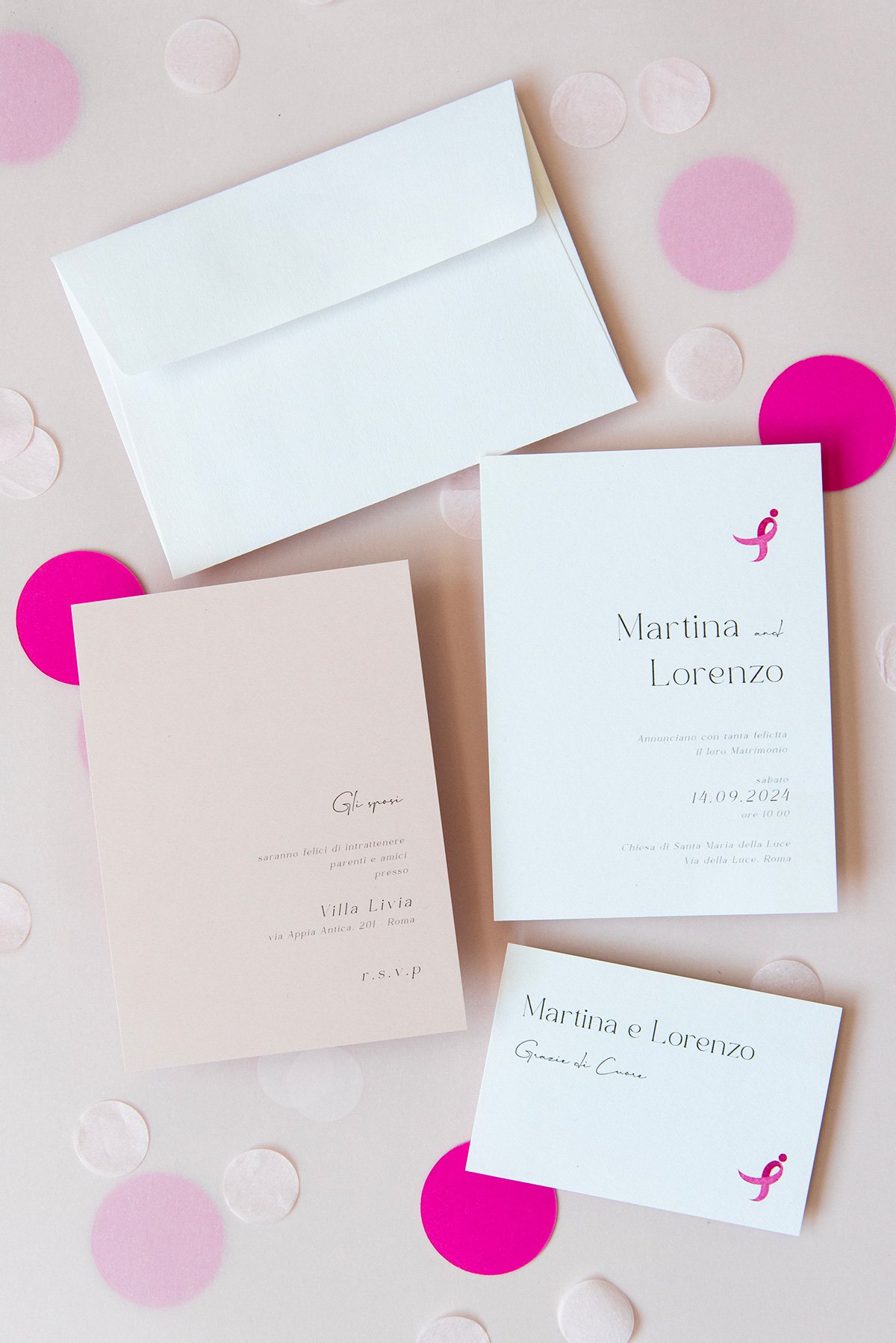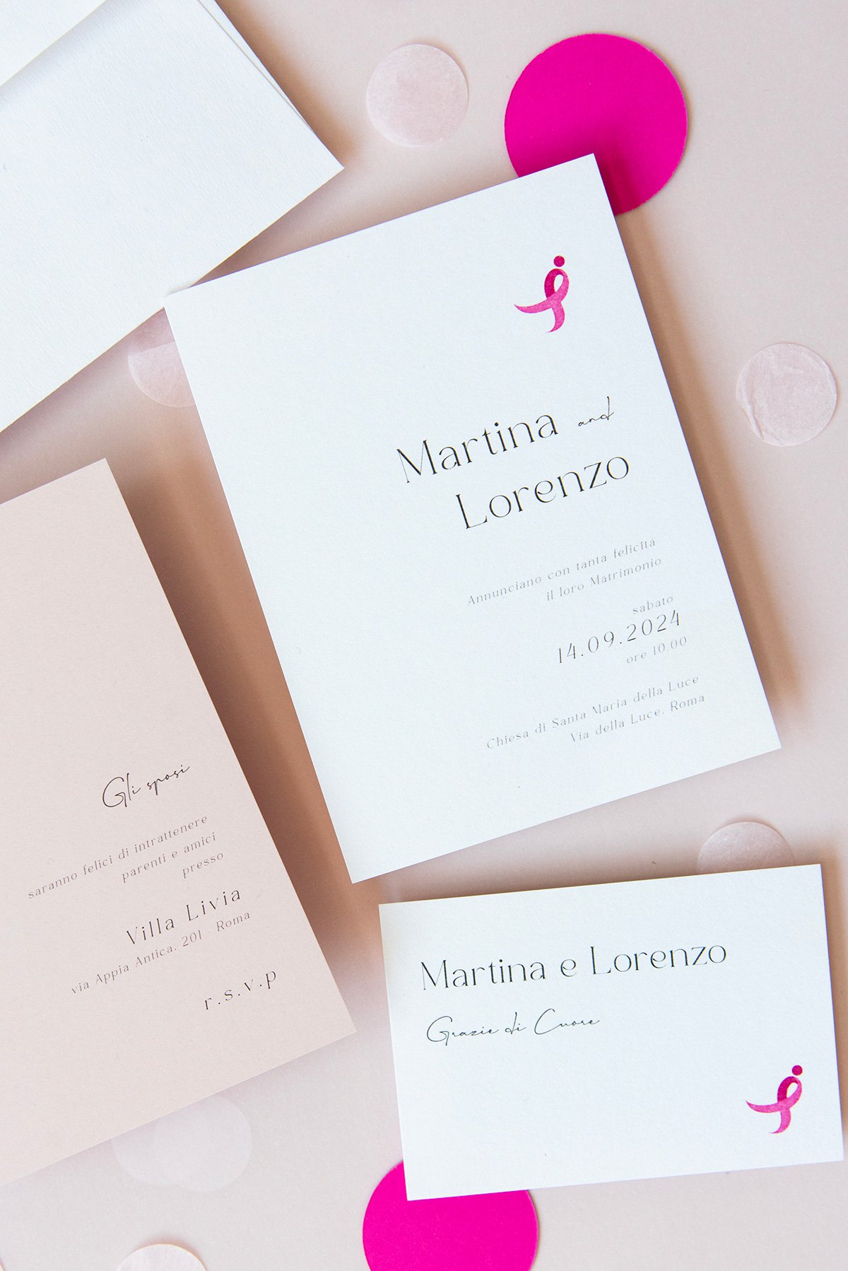 Una partecipazione istituzionale minimal composta da busta bianca e 3 biglietti di diverso formato: partecipazione, invito e biglietto lista nozze; il tutto delicatamente decorato con il Ribbon Rosa, simbolo della Komen italia.