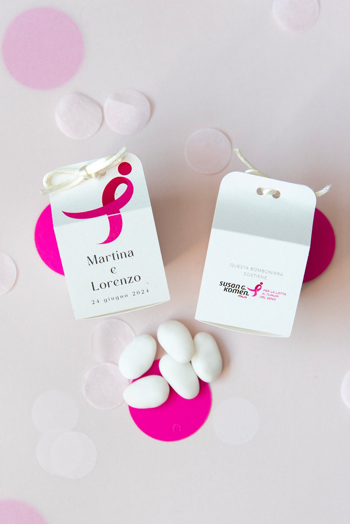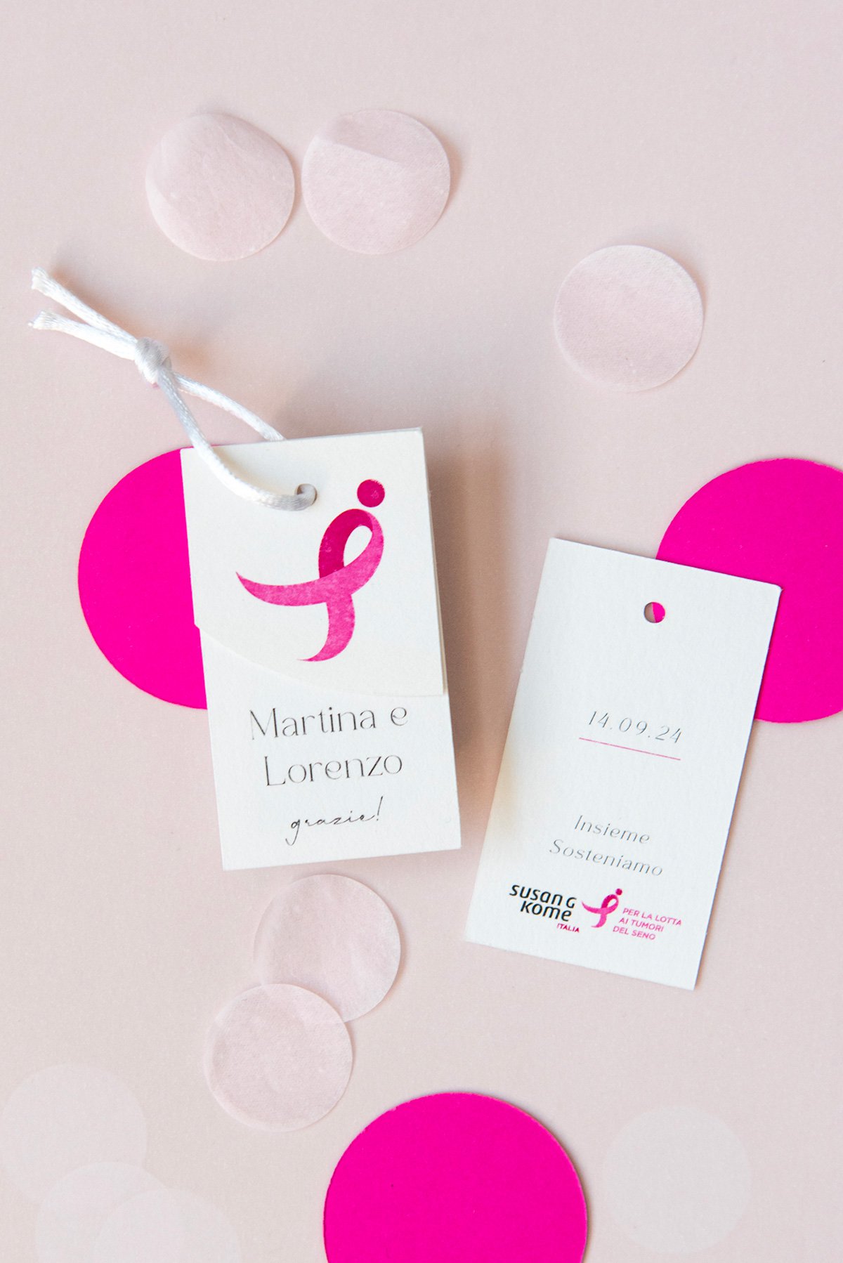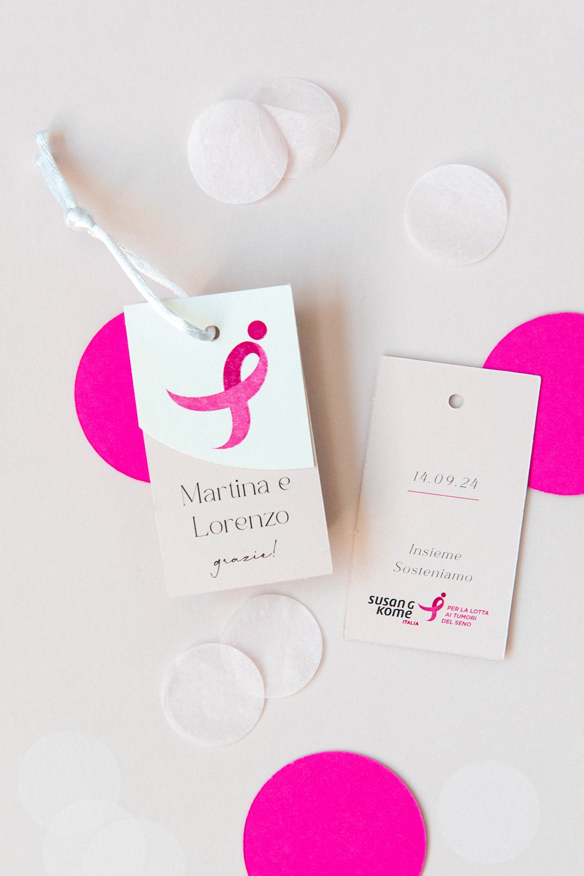 Il bigliettino tag solidale può essere usato per personalizzare qualsiasi prodotto (bomboniere, segnaposto, pacchetti regalo). Composto da due bigliettini, di cui uno impreziosito dal Ribbon Rosa simbolo di Komen Italia.
