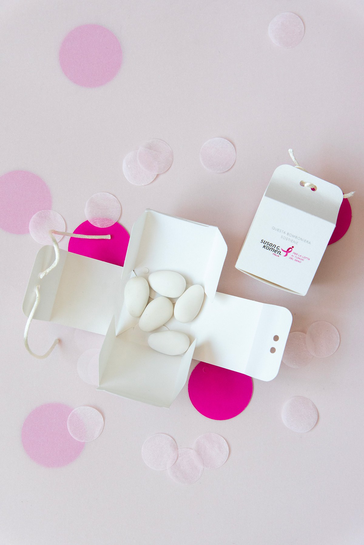 La scatolina porta confetti istituzionale è minimal ed elegante, con la presenza del Ribbon Rosa, simbolo di Komen Italia. È composta da due elementi di facile montaggio e chiusura con nastrino.