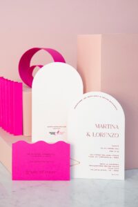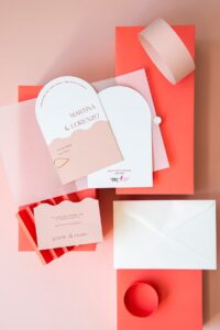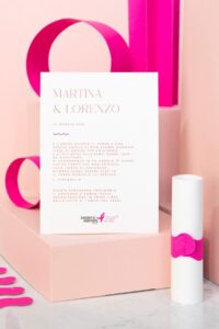 Una partecipazione istituzionale minimal composta da busta bianca e 3 biglietti di diverso formato: partecipazione, invito e biglietto lista nozze; il tutto delicatamente decorato con il Ribbon Rosa, simbolo della Komen italia.