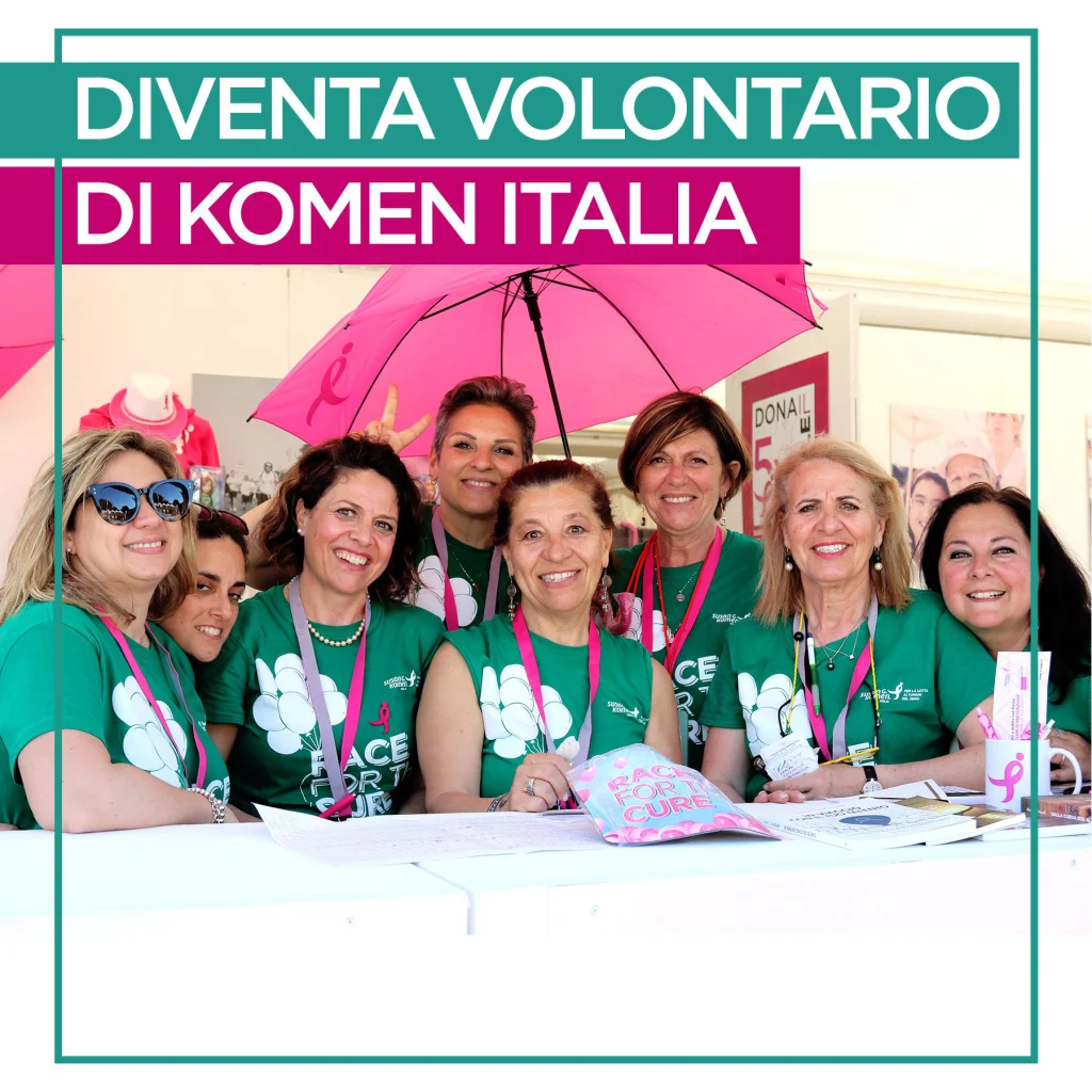 Fai la differenza nella vita di tante donne, entra nella grande famiglia di Komen Italia, insieme a te potremo portare la Prevenzione a chi ne ha più bisogno. Diventa volontario, aiutaci nella tua città o nel tuo quartiere. Abbiamo bisogno della tua motivazione, della tua passione e del tuo entusiasmo. Abbiamo bisogno di te.